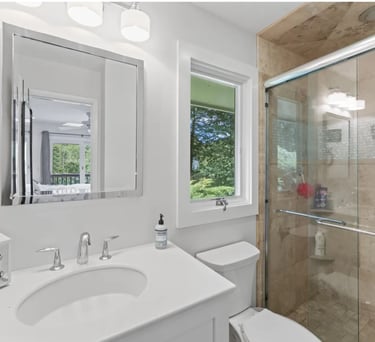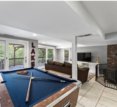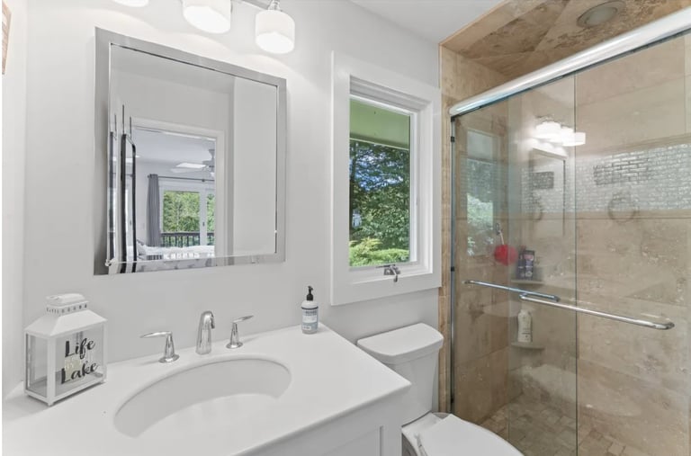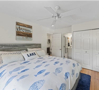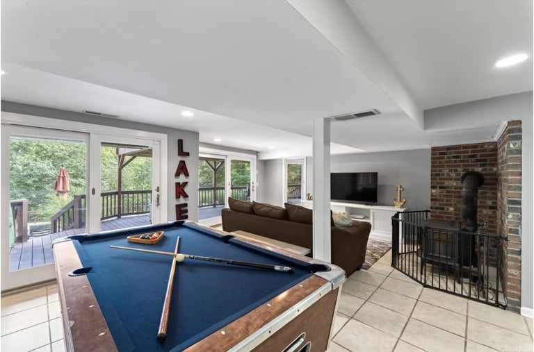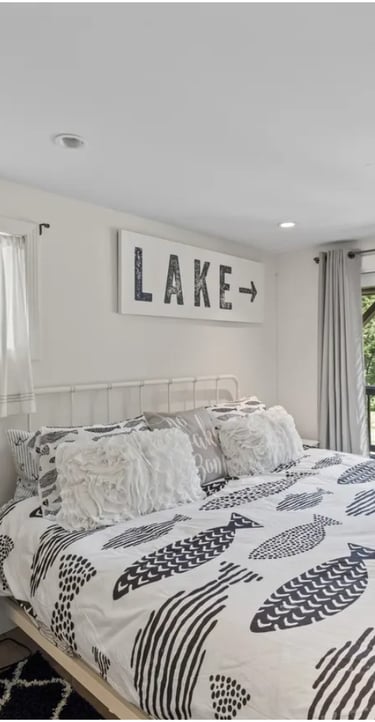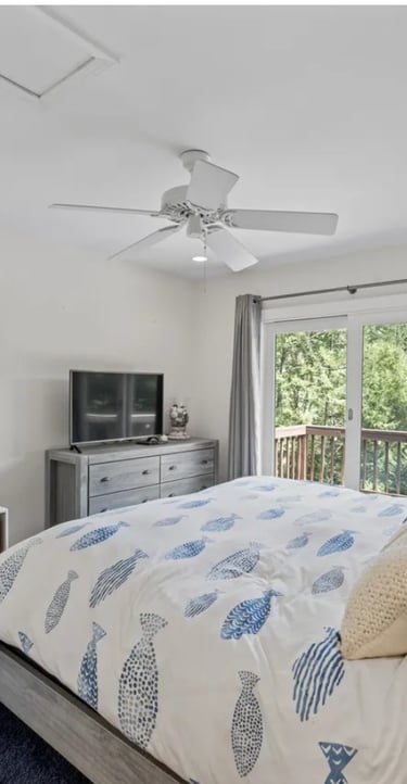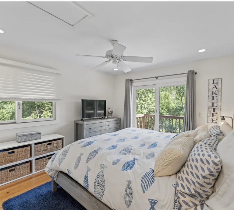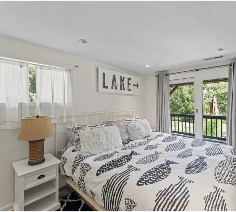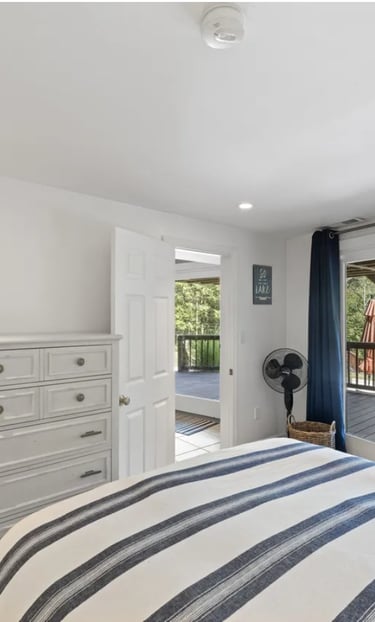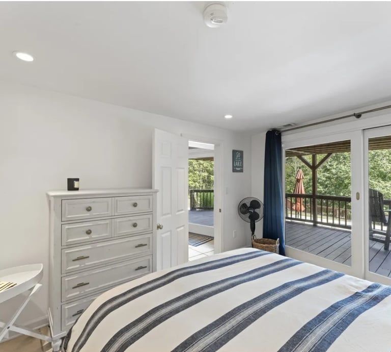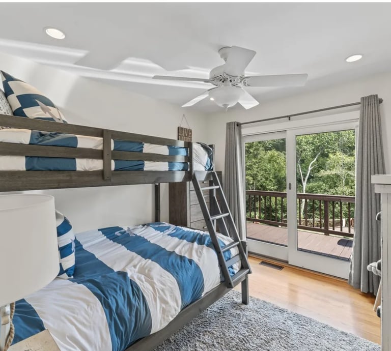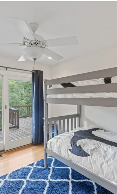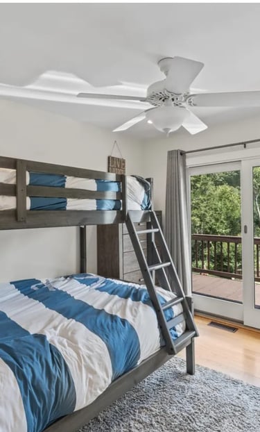 This bunk room has a queen lower bunk and twin upper bunk. There is deck access and lake views, sharing a full bath with a bathtub, ideal for families with kids.