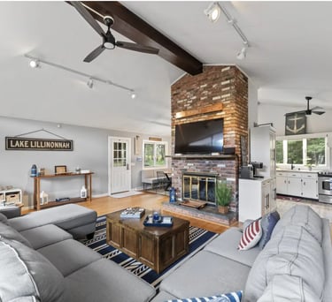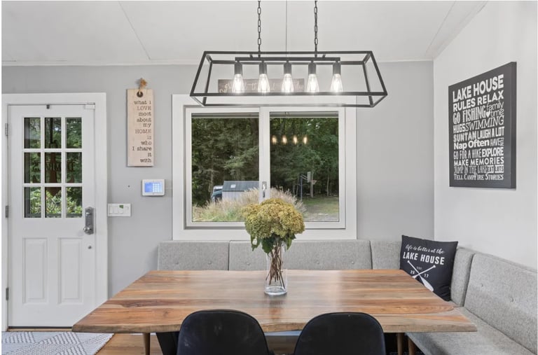 Generous living room with direct access to the upper deck, a cozy dining nook next to the kitchen. There is a central brick fireplace with a pellet stove. The kitchen is fully equipped and includes a dishwasher. There is a separate laundry room.