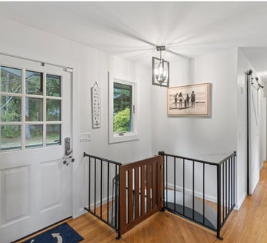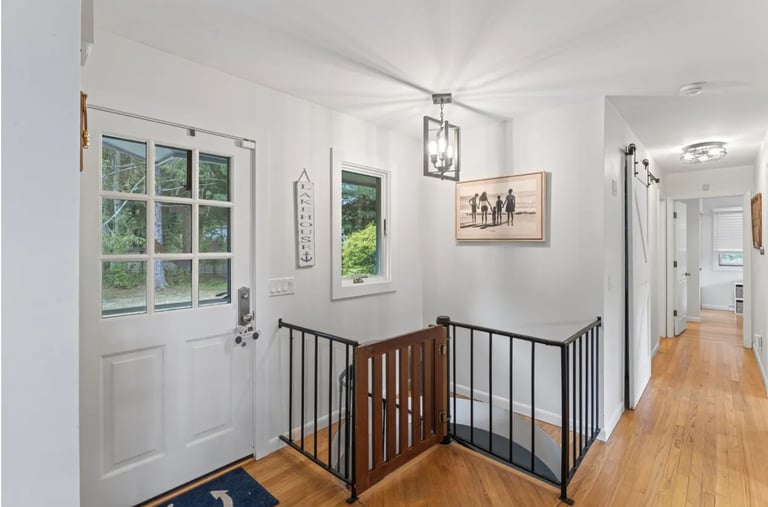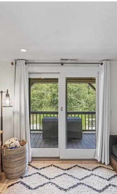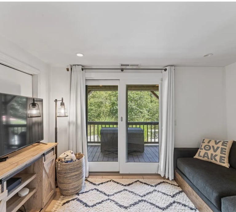 The lower level is accessed by a fun spiral stair case which has a gate at the top. There is a lower living room with a TV, woodburning stove. There is a shared full bathroom with a bathtub. All rooms have sliding doors to the lower deck.